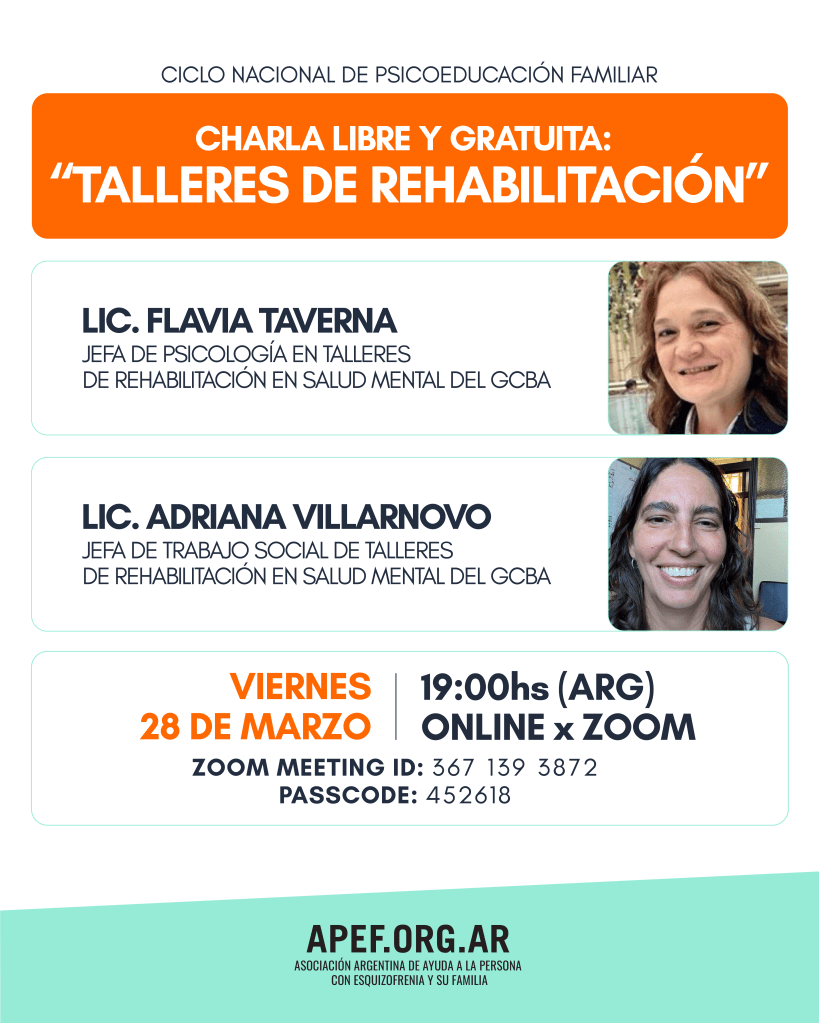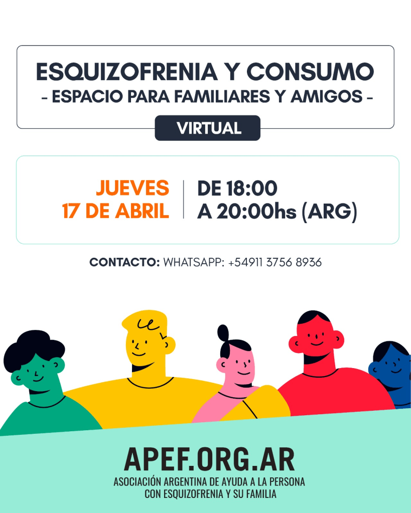 Para inscribirse, envían solo mensaje WhatsApp al celular de APEF (número: +54 9 11 5458 6695) solicitando la incorporación al Grupo de Esquizofrenia y Consumo, con los siguientes datos: