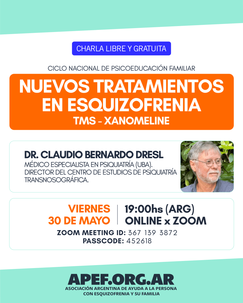 «NUEVOS TRATAMIENTOS EN ESQUIZOFRENIA – TMS XANOMELINE«, con el Dr. Claudio Bernardo Dresl. ONLINE, LIBRE Y GRATUITA