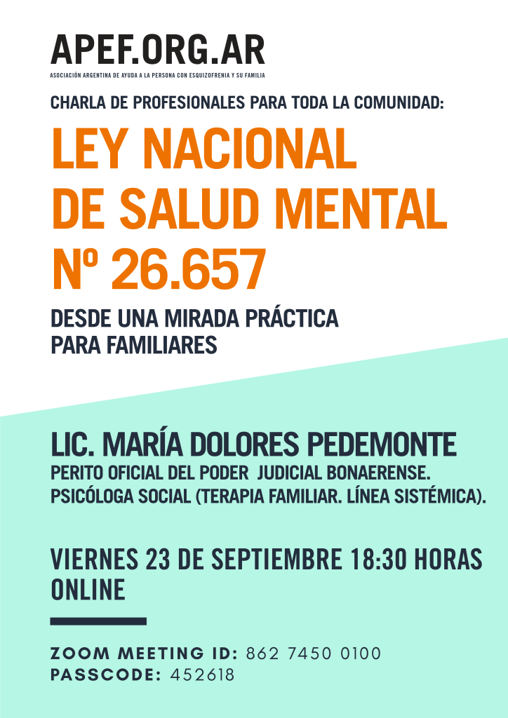 «Ley Nacional de Salud Mental Nº 26.657. Desde una mirada para familiares», con la Licenciada María Dolores Pedemonte. Viernes 23 de septiembre, 18:30 hs, ONLINE.