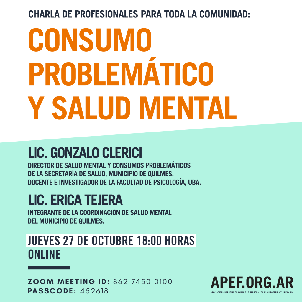 «Consumo Problemático y Salud Mental», con el Lic. Gonzalo Clerici y la Lic. Erica Tejera. Jueves 27 de octubre, 18:00 hs, ONLINE.